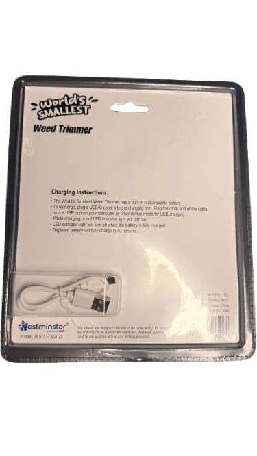World's Smallest Weed Trimmer is the perfect gift for the person in your life that loves their yard work! Yes, it really works! This toy replica of an industrial Weed Trimmer is a funny gag gift. It comes with a charging wire.